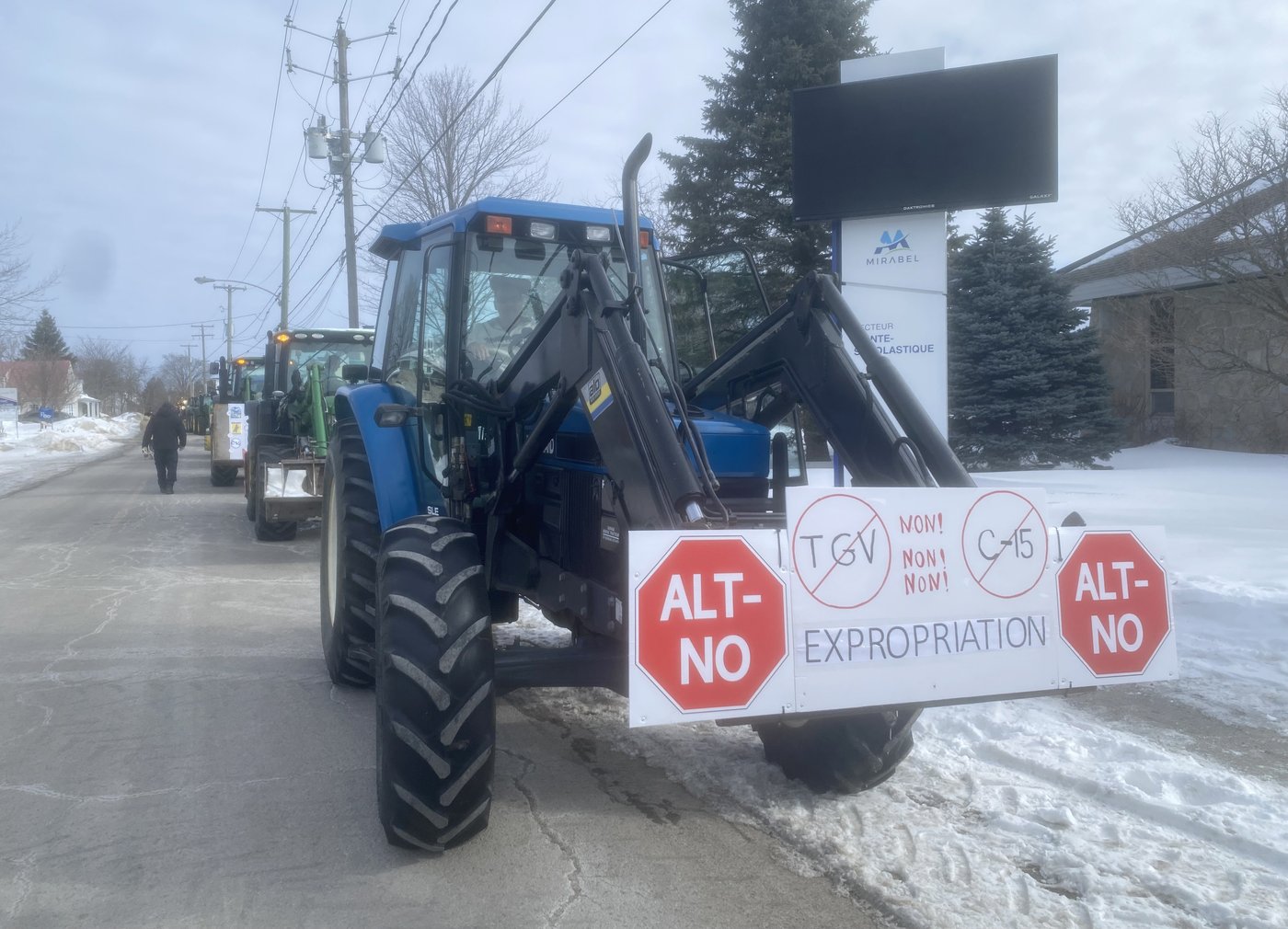 MIRABEL — Des producteurs agricoles ont manifesté mardi matin à Mirabel contre le projet de loi C-15 et contre le projet de train à grande vitesse (TGV) qui relierait Québec et Toronto.