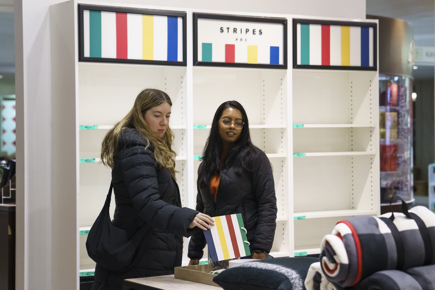 Pendant que M. Bursten parlait, des clients cherchaient le moindre produit portant les signes distinctifs de la marque. Alors qu’il semblait y avoir beaucoup de casquettes et de chaussettes, aucune des couvertures tant convoitées — le produit le plus emblématique de La Baie d’Hudson — ne restait en rayon.