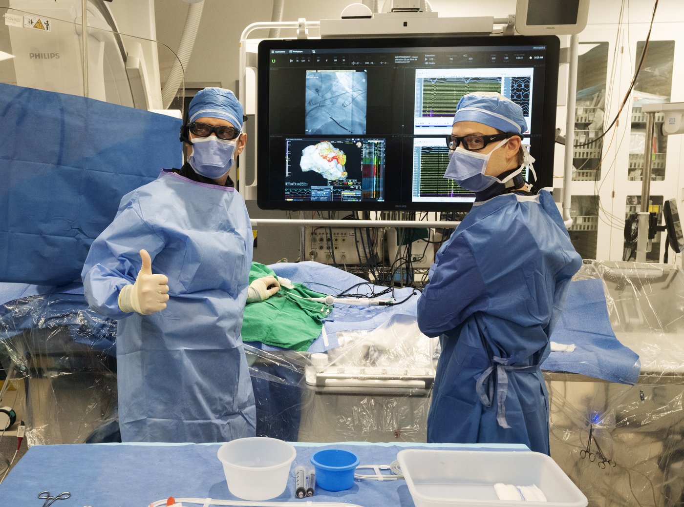 De plus, de nos jours, les interventions sont peu invasives. Des cathéters peuvent être insérés dans un vaisseau sanguin et montés jusqu’à l’intérieur du cœur où le médecin va déployer ses outils, par exemple pour déboucher des vaisseaux ou fermer des trous. De cette façon, le médecin n'a pas besoin d'ouvrir le thorax pour une opération.