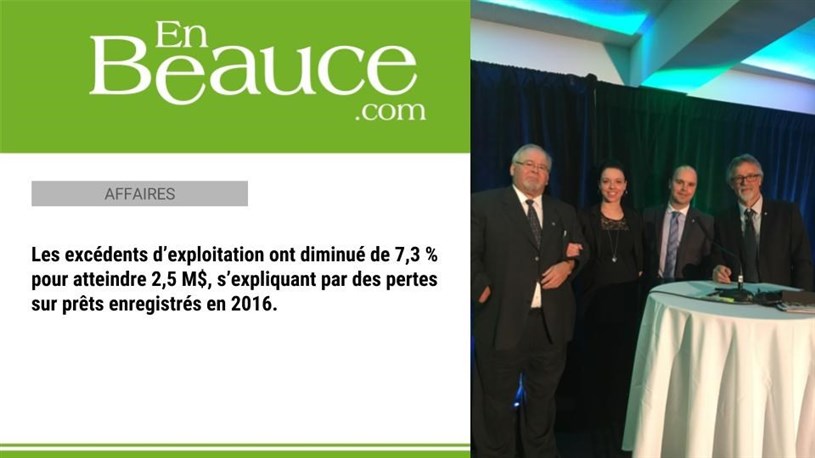 Au cours de cette période, les excédents d’exploitation ont diminué de 7,3 % pour atteindre 2,5 M$, s’expliquant par des pertes sur prêts enregistrés en 2016. L’avoir de la Caisse reflète sa solidité financière, lui qui a connu une hausse remarquable de 3,9 % pour s’établir à 40,8 M$, comparativement à 39,3 M$, au 31 décembre 2015.