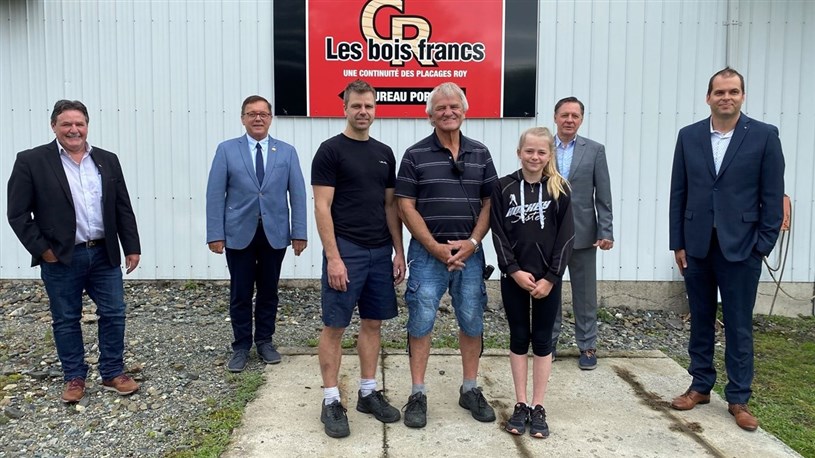 Sur la photo : (à l’arrière) Serge Jacques du CLD Robert-Cliche, Mario Groleau de la Municipalité de Tring-Jonction, Daniel Chaîné du CLD Robert-Cliche, Éric Brousseau de Raymond Chabot Grant Thornton (partenaire officiel des Sommets 2021). (À l’avant) Yannick Roy (fils et relève de M. Carol Roy), Carol Roy, Bois Francs CR, Mia Roy (petite-fille de M. Roy qui est la 4e génération impliquée dans l’entreprise).