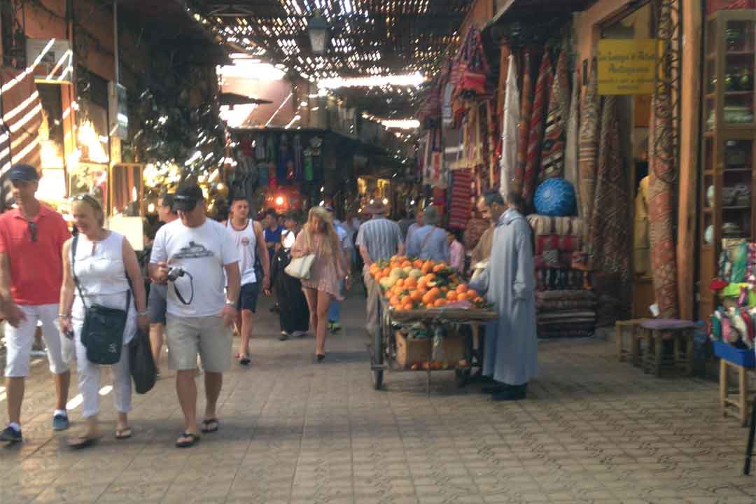 Marrakech surnommée, Perle du sud Porte du Sud, Ville rouge, Ville ocre…, est située au pied des montagnes de l’Atlas. Divisée en deux parties, vous aimerez visiter le quartier nouveau et vous serez fascinés par la *Medina* c’est-à-dire le quartier historique. Une visite de ce dernier vous conduira entre autres aux souks (marchés)colorés et bruyants où vous serez éblouis par le travail des artisans, la multitude de minuscules échoppes, l’odeur des épices et les mille métiers qui s’y côtoient. Prévoyez du temps pour vous plonger dans cet univers, pour marchander vos souvenirs et admirer le travail des artisans. Une visite de la place *Jemaa-el-Fna* s’impose. Animée de jour comme de nuit, elle est un lieu de rencontre et le rendez-vous des marchands berbères et des voyageurs. Vous y trouverez des conteurs, des herboristes, des arracheurs de dents et des écrivains publics; vous y verrez des amuseurs de tout genre : charmeurs de serpents, acrobates, cracheurs de feu…