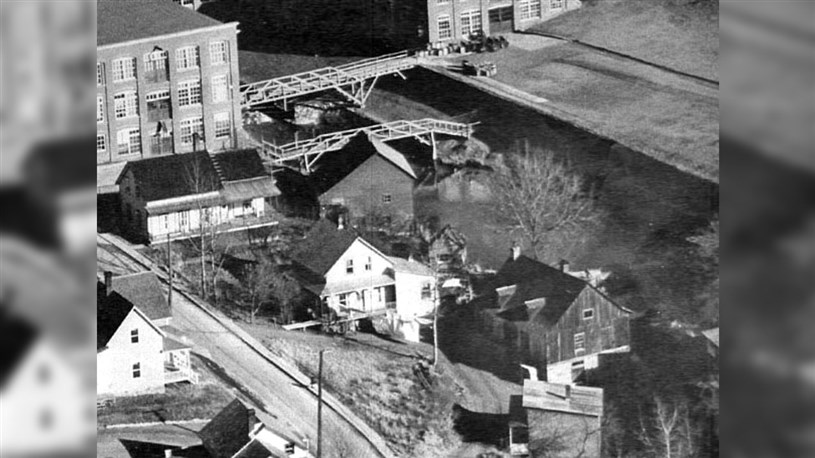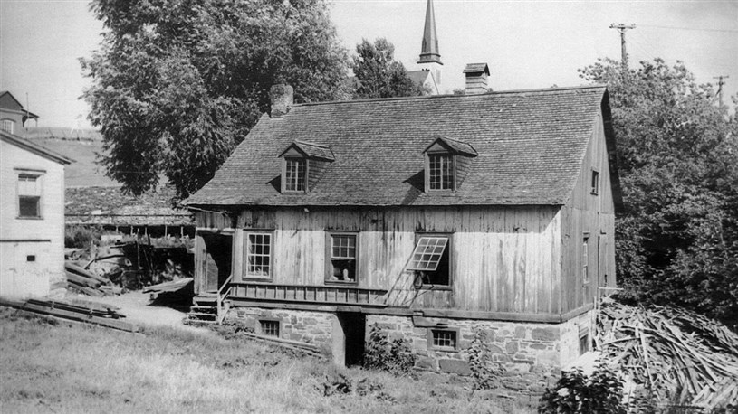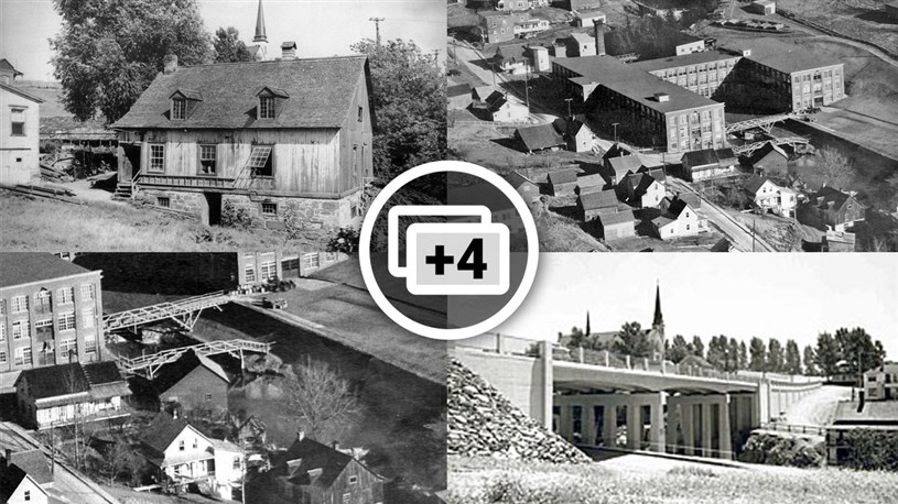 Vous serez étonné d'apprendre que la 1re photo, qui semble nous montrer un très ancien édifice, a été prise vers 1954, peu de temps avant qu'il ne soit démoli. En effet, cet ancien moulin était encore en fonction dans les années '50 et ce, en plein centre-ville. Voyez, en arrière-plan, le clocher de l'église l'Assomption qui fut érigée en 1951-52. Il s'agit du moulin Brochu, qui fut construit en 1862 par Maxime Brochu. C'était à la fois un moulin à carder, à scie et à farine. Il fut exploité par trois générations de Brochu, Maxime, Alphonse et Paul-Émile en dernier. Pourquoi avoir démoli un si bel édifice patrimonial?