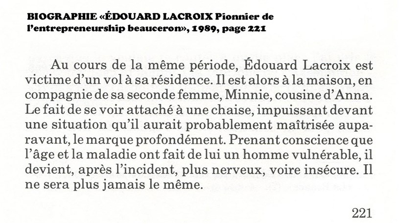 Un vol qualifié est un vol à main armée. Incroyable: il y a une personne encore vivante qui fut témoin d'un vol survenu à la résidence d'Édouard Lacroix il y a 70 ans (grande maison, photo 1, qui se trouvait alors sur la boulevard Lacroix, en face d'où se trouve aujourd'hui le Motel Voyageur). Cette dame, Yvonne Parent, est encore vivante, âgée de 96 ans, très lucide et elle réside à l'Oiseau Bleu. À mon grand étonnement, elle m'a raconté cet événement en détail, sans aucune note et sans aucune hésitation. Elle a travaillé comme domestique chez M. et Mme Lacroix (photo 2) de l'âge de 23 à 28 ans. Le 4 mai 1948, à 10,20h du soir, on a sonné à la porte et Mme Lacroix a ouvert. Trois individus armés ont fait irruption, ils venaient voler. Deux complices les attendaient dehors. Ils avaient coupé le fil de téléphone et avaient des lampes de poche. Ils les ont ligotés solidement sur les chaises de la salle à diner. Ayant demandé où était le coffre-fort, M. Lacroix leur a indiqué l'endroit en ajoutant que celui-ci n'était pas barré puisqu'il ne contenait aucun argent, mais que de la paperasse. Après vérification, la tension a monté car les bandits refusaient de partir les mains vides. M. Lacroix leur donna alors 800$ en argent qu'il avait dans ses poches, qu'un débiteur était allé lui rembourser dans la journée. Finalement, les trois voleurs les ont menacés et intimés de ne pas bouger tant qu'ils ne seraient pas rendus loin de la résidence. Ces malfaiteurs venaient de Montréal, et ils s'en sont retournés en passant par Lac-Etchemin, où ils ont fait une embardée, ayant percuté une maison. Ils se sont fait remorquer à Montréal, ce qui leur a coûté 300$. Ce qu'ils ne savaient pas, c'est que M. Lacroix détenait d'importantes sommes d'argent dans une commode cachée derrière une corde de bois au sous-sol. De plus, M. Lacroix avait l'habitude de toujours noter les numéros de série des billets de 100$ qu'il avait. Il contacta un détective de Saint-Joseph, un M. Pettigrew, qui fit enquête et réussit à retracer ces cinq voleurs. Mme Parent m'a défilé leurs noms sans hésitation: Éthier, Hamel, Delorme, Lavoie et Larche, spécifiant qu'ils furent traduits devant les tribunaux et condamnés à la prison. Mme Parent a ajouté qu'elle avait failli mourir de peur et qu'elle avait eu mal aux bras pendant 2 mois. Parce que les lascars l'avaient attachée trop fort, lui ai-je demandé. Non, a-t-elle répondu «c'est parce que j'ai trop tremblé que ça m'a causé ces terribles douleurs». Wow, une mémoire prodigieuse Mme Parent, toute une mésaventure qu'elle a racontée à brûle-pourpoint, sans hésiter une seconde. Par la suite, j'ai trouvé un article de journal confirmant que ces criminels avaient été condamnés en septembre 1948 à 9½ ans de pénitencier chacun, sauf Lavoie et Delorme qui ont eu 5½ ans. Ce n'était pas encore l'époque des sentences bonbon. Le plus extraordinaire, c'est la fin de cette histoire: en plus du pénitencier, la sentence leur imposa 6 coups de fouet chacun. Édouard Lacroix lui-même en fut sidéré, il trouva cette sentence beaucoup trop lourde, il est même allé jusqu'à aider ceux qui l'ont assailli ainsi que leurs épouses. Auriez-vous cru qu'un tel châtiment existait encore en 1948? C'était avant qu'on élabore la notion de «sentence cruelle et inusitée». Ce châtiment corporel cessa d'être appliqué à partir de 1954 et fut officiellement aboli par la loi en 1972.