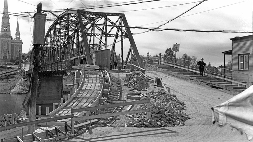 Le pont de fer de la première photo fut érigé en 1929 et démoli en 1971. Il était superbe. Cette photo, prise vers 1956-57, rappelle que les gens étaient nombreux à le traverser à pied. Ceux qui l’ont connu, les plus de 50 ans, ne l’ont pas oublié. Un autre pont de fer l’a précédé, de 1912 à 1929. Les deux se ressemblaient, mais le premier était plus étroit et n’avait pas de trottoir, ce qui causait des problèmes à ceux qui y circulaient à pied. En 1912, la quasi-totalité des véhicules étaient des voitures à cheval, mais au fil des ans, la circulation automobile croissait sans cesse et nécessitait plus d’espace surtout lorsque deux camions devaient se croiser. Il fallait donc un nouveau pont plus gros, plus large et bordé de trottoirs des deux côtés. Celui-ci fut construit en 1929. Des modifications importantes furent apportées quelques années plus tard aux approches pour piétons dans la montée du côté Est. La 2e photo nous montre l’entrée Est du pont vers 1938, alors qu’on avait paré la structure de guirlandes et décorations à l’occasion de la Fête-Dieu, puisqu’on y tiendrait une importante procession religieuse; on constate qu’à cette époque, les autorités avaient incorporé au pavé des aspérités faites de blocs de granit taillés sur la longueur et cordés de chaque côté le long de la montée pour offrir une prise aux sabots des chevaux et pour qu’ils puissent s’agripper et éviter qu’ils glissent lorsqu’ils l’escaladaient vers l’ouest. Cette photo nous fait voir qu’il y avait aussi un escalier pour piétons de chaque côté, mais celui-ci n’était protégée d’aucune façon des véhicules. Sur la 3e photo, on y voit deux belles dames montant l’escalier nord, situation présentant un risque dans le cas où un véhicule déraperait ou perdrait le contrôle et foncerait vers l’escalier. On a remédié à ce problème à l’été 1944, lorsqu’on a érigé de nouveaux escaliers avec murets de béton empêchant tant les véhicules que les piétons d’empiéter l’un sur l’autre (photos 4). Voyez la voiture à cheval montant et le cycliste descendant à la photo 5 à l’époque de cette réparation. À la photo 6, c’est l’actrice Monique Miller descendant l’escalier sud avec son copain dans le film L’Immigré tourné à Saint-Georges en 1959, on y voit bien le parapet qui avait été érigé en 1944. Ce pont fait partie de notre histoire, mais il n’est plus qu’un souvenir. Ces photos anciennes perpétuent sa mémoire.