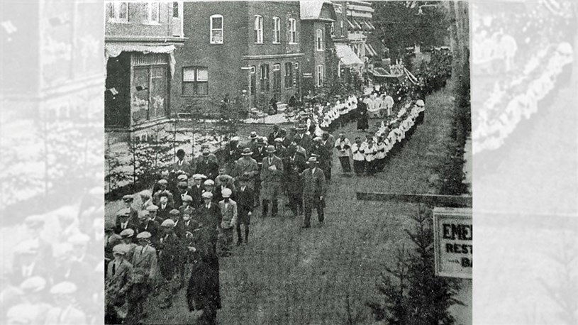 Il y a 100 ans, la ferveur religieuse était à son comble chez nous. La quasi-totalité des gens allaient à la messe à chaque dimanche et se conformaient strictement aux préceptes édictés par les autorités catholiques, parfois aussi astreignants que de jeûner au moins 12 heures avant de pouvoir communier ou de se priver partiellement de nourriture pendant le carême. Le summum était les nombreuses processions nous faisant déambuler en parade sur les principaux artères un peu partout en ville: la Fête-Dieu, la Fête du Sacré-Coeur, Fête de l'Assomption, la Fête aux flambeaux et bien d'autres, surtout pendant la période estivale. Généralement, pendant la procession, le prêtre portait l'Eucharistie dans un ostensoir et défilait abrité sous un dai porté par quatre participants. On possède plusieurs photos de ces longues processions se déplaçant en rangs serrés en différents endroits au centre-ville, comme sur la 1re avenue en 1919 (photo 1) et sur la 2e avenue en 1956 (photo 2). Parfois, les organisateurs érigeaient d'énormes arches faites de branches de sapin au-dessus de la rue où passait la parade. Une très ancienne, vers 1906, sur la 1re avenue au centre-ville (photo 3). On en voit une en face du magasin de l'horloger Alfred Perron (aujourd'hui Jouets Place Bureau) pas loin de la 123e rue vers 1907 (photo 4). Une autre vers 1938 à peu près en face de la Banque Royale (photo 5). Même une dans l'ouest près de la 24e rue vers 1960, maison Yvon Thibaudeau (photo 6). Le moment le plus important était l'arrêt au reposoir, endroit où on avait érigé un autel temporaire, là où le prêtre procédait à une cérémonie religieuse et donnait sa bénédiction. Une photo extraordinaire montrant le reposoir des frères Thibaudeau à leur magasin sur la 1re avenue vers 1922 (photo 7). Pendant plusieurs décennies, les propriétaires géorgiens rivalisaient d'ingéniosité pour ériger le plus extravagant reposoir sur le seuil de leur résidence. Voyez les gens agenouillés dans l'escalier menant au reposoir installé devant l'ancienne maison de Gédéon Gagné sur la 2e avenue (photo 8). On changeait de place à chaque année, et c'était à qui aurait le plus beau jamais réalisé. Celui chez le maire Rémi Bolduc sur la 2e avenue coin 123e rue en 1927 (photo 9). C'était considéré comme un honneur que d'être choisi, comme le démontrent toutes ces photos anciennes. En 1942, sur le parvis de l'église dans l'Ouest (photo 10). La dernière procession à Saint-Georges, à ma connaissance, fut la Fête-Dieu du 25 mai 2008, qu'on voit parader dans la 18e rue à la photo 11. Incroyable: j'ai trouvé une photo ancienne (vers 1936-37) où on aperçoit une imposante structure faite de gros madriers partant de l'ancien pont de fer, avec drapeaux et décorations, où l'on voit des citoyens endimanchés circulant sur cette construction inusitée (photo 12). Il n'y a qu'une manifestation religieuse pour justifier des travaux aussi extravagants. Il semble qu'à cette occasion, on avait même décoré de guirlandes les poutres et les murets de l'entrée du pont, dans l'est (photo 13). La plupart ont aussi connu les processions au flambeau, qui avaient lieu le soir, pour mieux contempler l'éclairage spectaculaire des centaines de participants (photo 14). Puisque les gens marchaient en groupe, la flamme aurait vacillé et se serait éteinte si on ne l'avait pas protégée au moyen du flambeau. On fournissait des portes-cierges constitués d'une chandelle insérée dans un trou pratiqué dans le fond du protecteur cartonné. Mais il arrivait que le feu prenne dans le flambeau... Quels souvenirs.