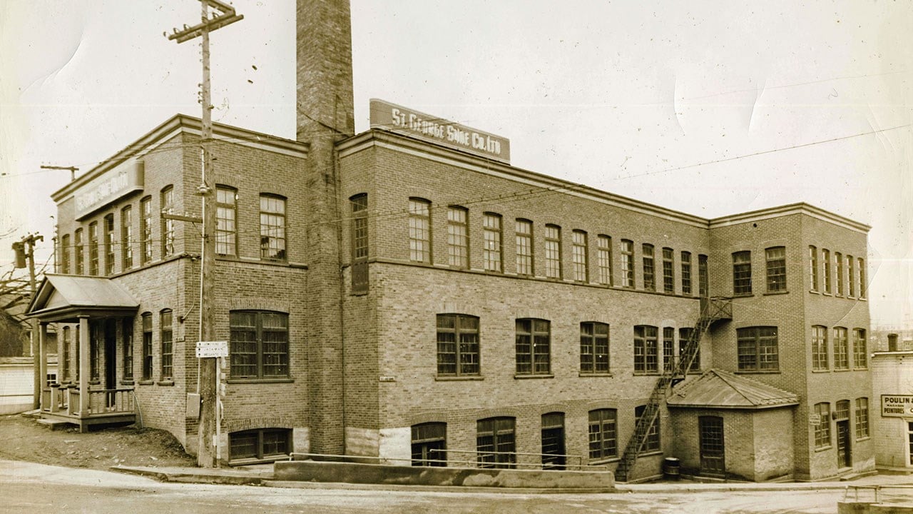Contrairement aux autres usines de l'époque qui conservaient toutes leur nom anglais, on a toujours nommé celle-ci «la manufacture de talons». On fonda d'abord la manufacture «St-George Shoe Co Ltd» en 1932 (photo 1), mais on réalisa rapidement que c'était un problème de se procurer les multiples genres de talons pour les souliers des dames, difficultés d'approvisionnement et de modèles, changements fréquents de mode, délais de livraisons etc. On démarra donc la même année un atelier de fabrication de talons qui a connu des débuts modestes, à l'étage inférieur d'un grand garage situé au coin de la 118e rue et de la 2e avenue, qu'on voit à la 2e photo.