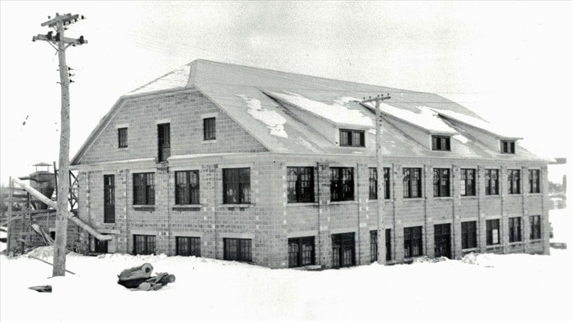 Au cours des années '50, l'importation de talons de plastique entraina une importante diminution des affaires de notre usine de talons, si bien qu'on abandonna finalement ce domaine. Un incendie a lourdement endommagé l'édifice vers 1958, voyez une photo à la même époque (photo 5). Cet immeuble a donc été d'abord la manufacture de talons (de 1938 à 1958). On l'a agrandie et le transformée en 1959 pour y loger la manufacture de chaussures (photo 6).