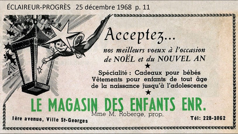 Voyez une publicité du Magasin des Enfants de Mme Roberge dans le journal local du 25 décembre 1963 (photo 5). Celle-ci ne ménagea aucun effort pour attirer la clientèle. Ainsi, pendant plusieurs années, elle organisa une promotion annonçant qu'elle remettrait un cadeau aux parents du premier enfant naissant à Saint-Georges au cours de la nouvelle année. Voyez un reportage paru à ce sujet dans l'Éclaireur-Progrès du 7 janvier 1965; Mme Roberge est à droite sur cette photo, elle était une dame souriante et toujours élégante (photo 6). Elle est décédée en l'an 2000 à l'âge de 75 ans.