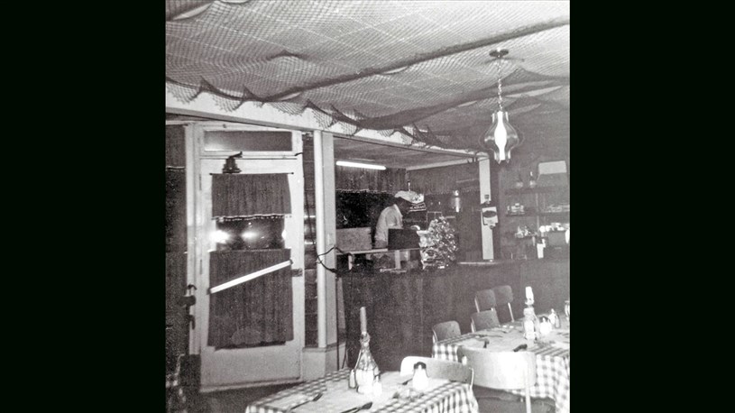 Vers 1968, il déménagea juste en face et installa son commerce au rez-de-chaussée, tandis que sa famille résidait au deuxième (photo 4). C'était un style vraiment unique comme local. Les tables étaient recouvertes de nappes à carreaux rouge et blanc (photo 5) sur lesquelles il y avait au centre une bouteille décorative de vin Chianti dans laquelle était insérée une chandelle, de sorte que la cire s'accumulait au fil des semaines autour de toute la bouteille dont le bas était décoré de paille, comme on le voit à la 6e photo. Décoration à la fois simple mais si originale. Et il y avait aussi des filets de pêche au plafond, créant une atmosphère unique (photo 7).