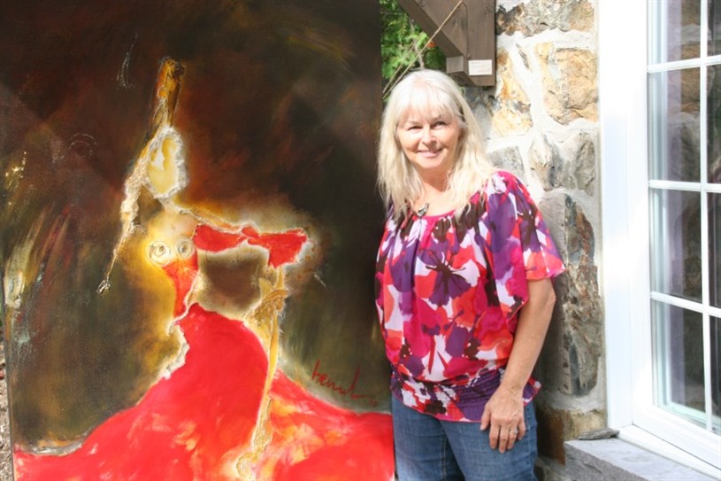 Lise Bernard, présidente de la Corporation des artistes et artisans de la Beauce, ainsi que son œuvre d’art. Cette toile, dévoilant le corps d’une femme séductrice et en mouvement, a probablement été le coup de cœur des visiteurs.