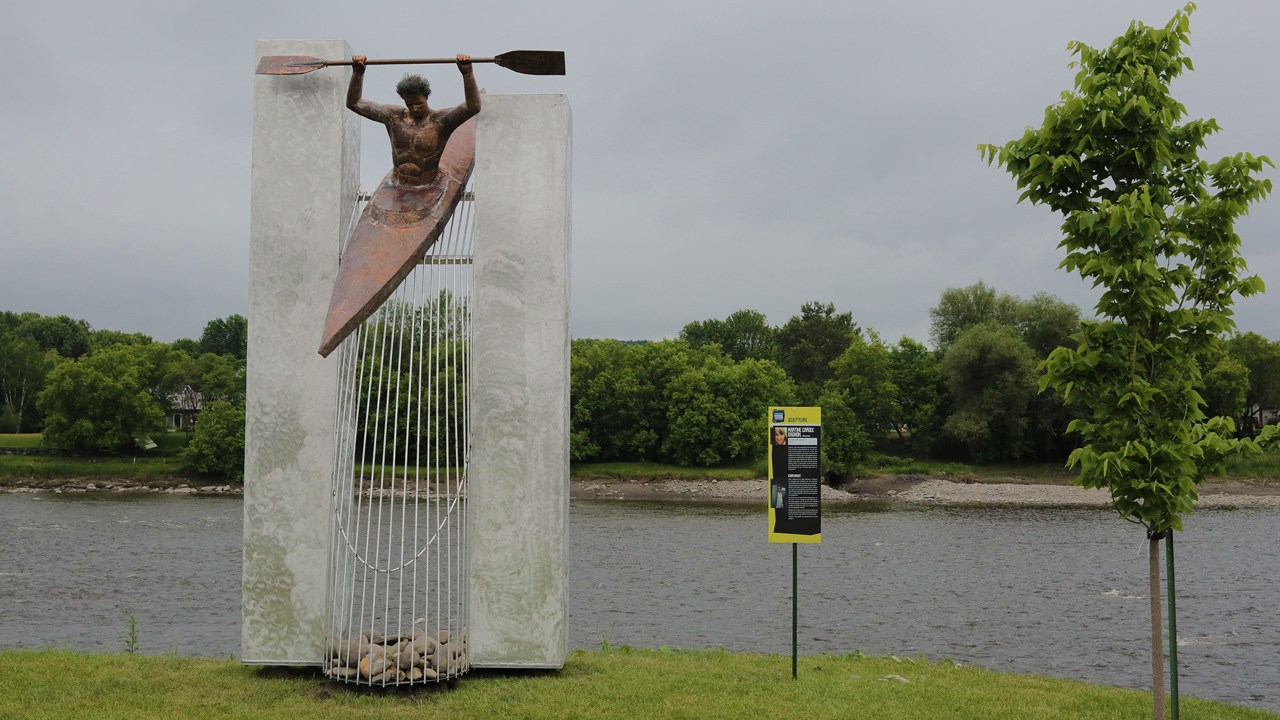 Pour ceux et celles qui souhaitent voir en vrai l’imposante sculpture intitulée « La Force du courant », précisons que cette dernière a été érigée en face du Centre sportif Lacroix-Dutil, aux abords de la rivière Chaudière.