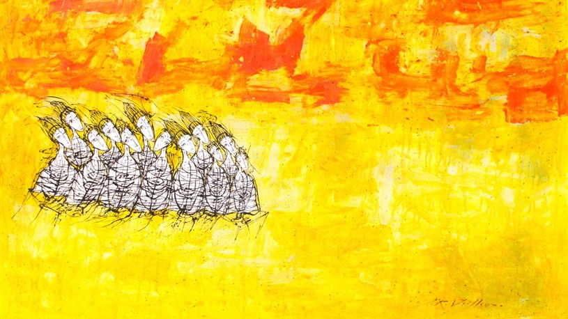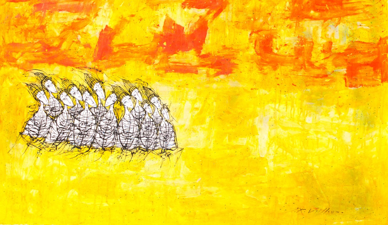 Évaluée à 3 500 $, l’œuvre de l’artiste de Saint-Georges en acrylique sur papier Rives intitulée « Les allants d’ailleurs » mesure 46’’ x 33’’ (101 x 76 cm).