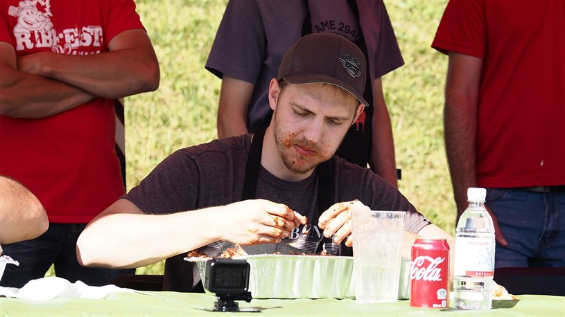 À la suite d'une compétition relevée, le gagnant du concours du plus gros mangeur de côtes-levés présentait fièrement son prix, le visage rayonnant encore recouvert de sauce rouge.