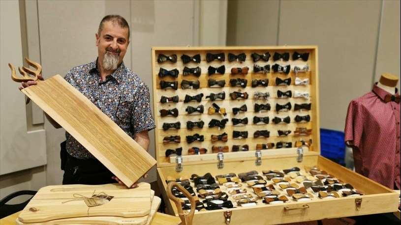 Pour sa part, l'artisan Daniel Potvin présente une belle collection de planches à découper, pour les fromages et les charcuteries, ainsi que des planches de présentation en restauration, fabriquées à partir d'essences nobles comme le noyer, le chêne et le cerisier. Il réalise également des noeuds papillon prêt-à-porter qui sont faits en bois ou en plumes d'oiseaux exotiques.
