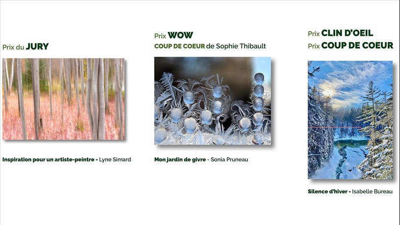 Parmi celles-ci, 30 ont été sélectionnées et un total de 1 400 $ en prix a été remis à quatre photographes amateurs, en plus du coup de cœur de Sophie Thibault.