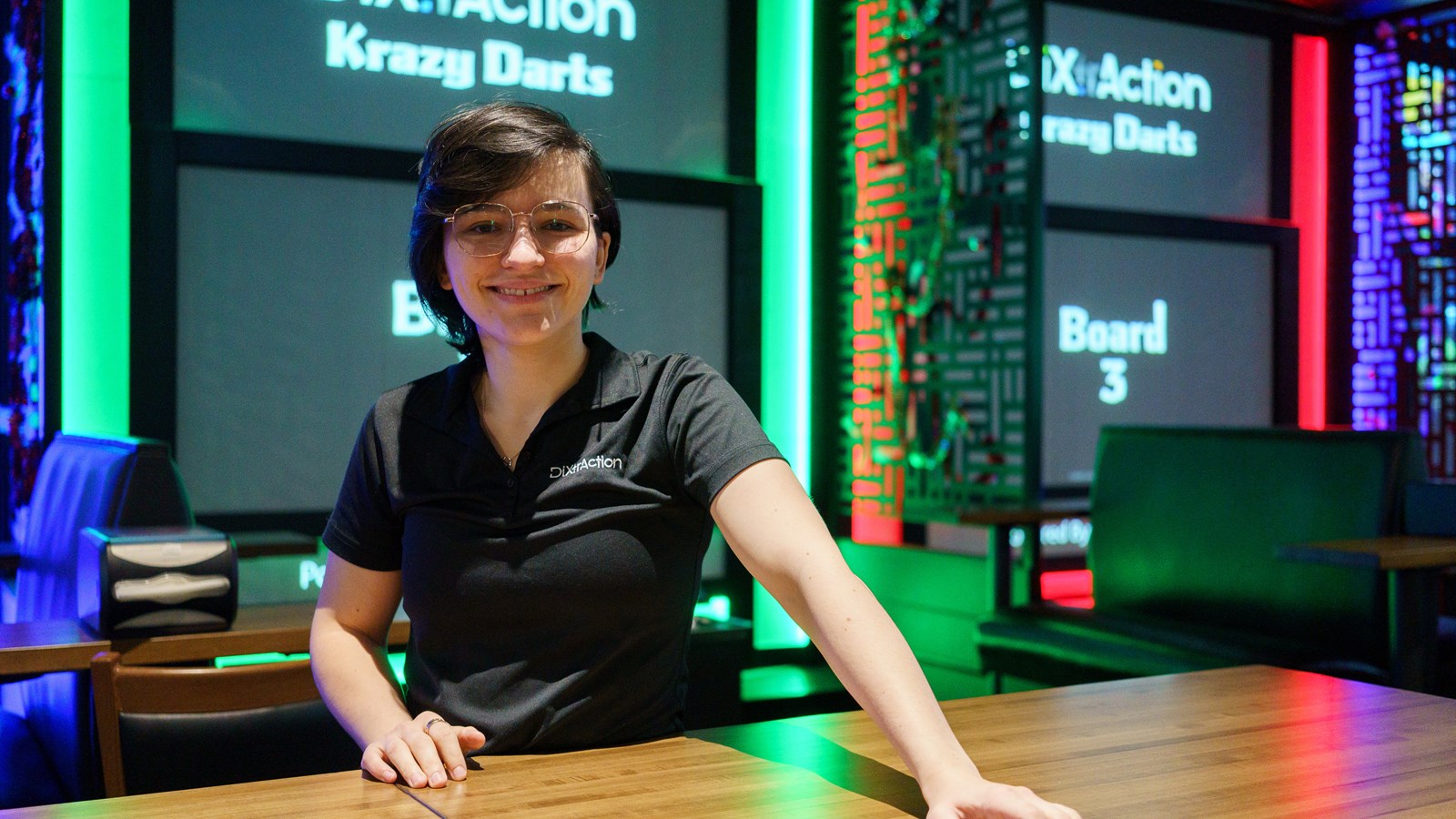 Point central de cette nouvelle section : le Krazy Darts, une attraction totalement réinventée… et une première au Canada. DiXtrAction est le tout premier centre à avoir implanté ce concept novateur. Ici, oubliez la cible traditionnelle, les jeux sont projetés sur un mur de 11 pieds de haut, tandis que des projecteurs intelligents détectent chaque lancer de fléchette et comptabilisent automatiquement les points.