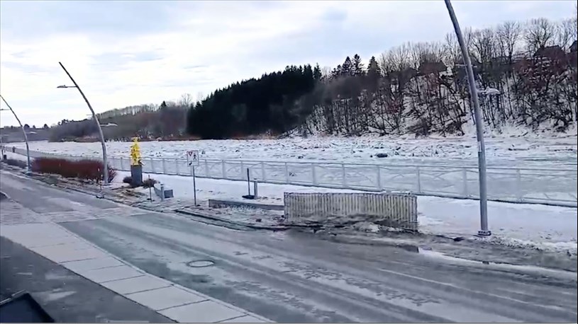 La couche de glace de la rivière Chaudière s'est fracassée aujourd'hui au centre-ville de Saint-Georges et les morceaux sont en mouvement.