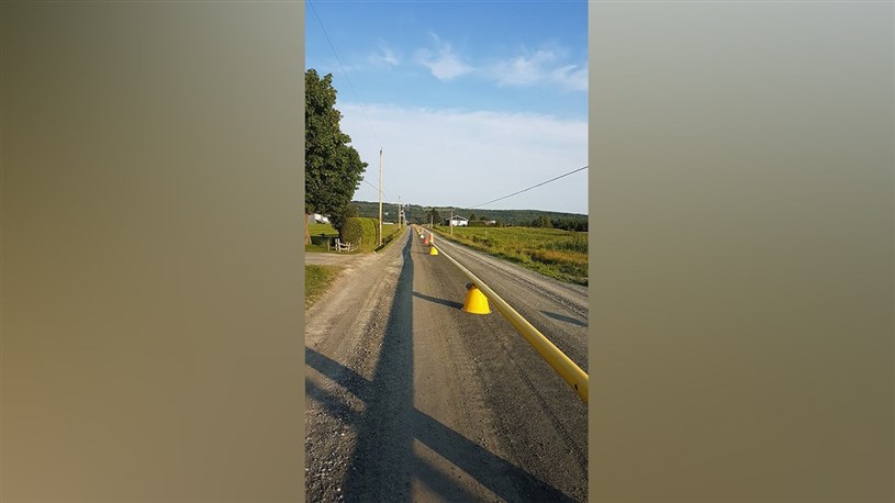 Vers 15 h 40, Noémie Prégent-Charlebois, porte-parole d'Énergir, nous a téléphoné. Ces travaux visent à desservir la MRC des Appalaches et la MRC de Beauce-Sartigan en gaz naturel. Selon la porte-parole, le tuyau est placé en plein de milieu de la voie parce qu'il doit être soudé avant d'être mis sous la terre.
