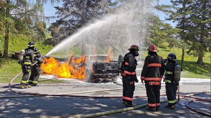 Une camionnette de type pick-up a été complètement consumée par les flammes en raison d'une fuite au réservoir à essence qui a pris feu.
