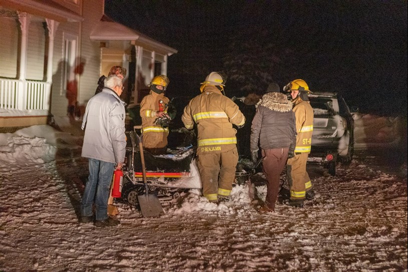 Vendredi soir, vers 20 h 15, le Service de sécurité incendie de Saint-Benjamin s’est déplacé sur l’Avenue Principale croyant au départ intervenir pour un incendie de résidence. À leur arrivée, ils ont constaté qu’il s’agissait d’une motoneige qui a pris feu non loin de la maison.