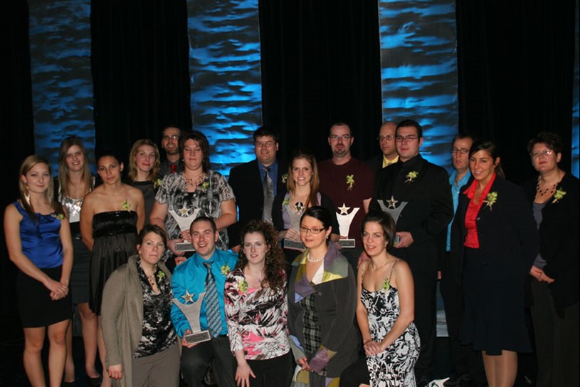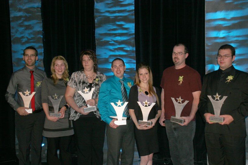 Les gagnants du Gala distinction jeunesse 2010 (de gauche à droite) : Simon Beaudoin, Marie-Claude Bilodeau, Mélanie Veilleux, Philippe Gagnon St-Gelais, Alexandra Doyon, Luc Lavallée et Pyer-Luc Parent.