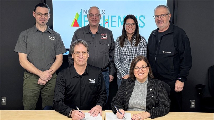 Les deux signataires de l'entente, Yohan Perron,directeur de la Fédération Québécoise des Clubs Quad (FQCQ) et Judith Leblond, directrice générale de la MRC des Etchemins, accompagnés de Julien Simard, agent de liaison de la FQCQ, Éric Vachon, président du Club VTT Jaroboce, Émilie Bédard, conseillère en aménagement du territoire et en environnement de la MRC des Etchemins, ainsi que Camil Turmel, préfet de la MRC des Etchemins.
