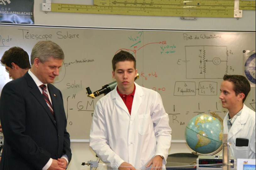 D’ailleurs, le premier ministre a visité le Cégep en compagnie de son collègue, Maxime Bernier, du député-ministre Robert Dutil et du directeur du Cégep, Michel-Louis Beauchamps. Dans un premier temps, M. Harper a pu constater les améliorations apportées à la bibliothèque et discuter avec l’entraîneur-chef des Condors, Christian Audet. Ensuite, il s’est rendu à un laboratoire de science nouvellement rafraîchie. M. Harper accompagné cette fois des députés Dutil et Bernier ont assisté avec les députés à deux expériences scientifiques.