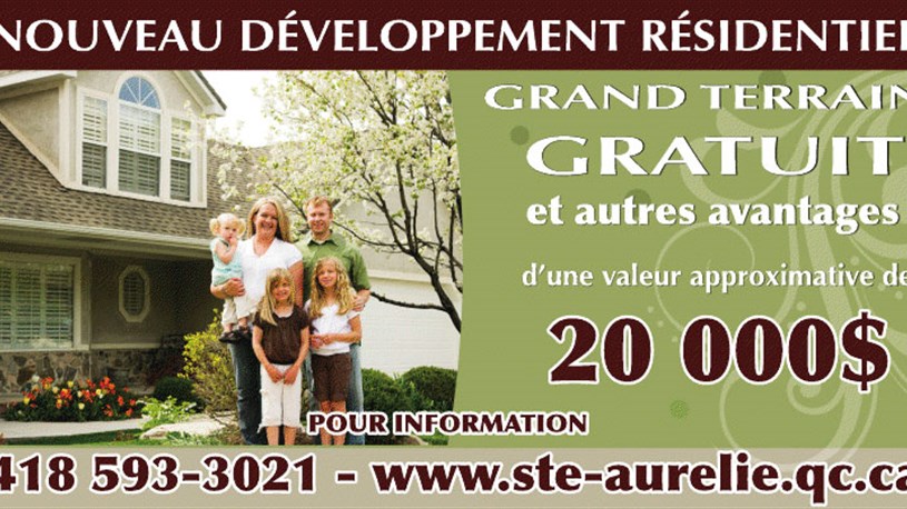 La municipalité de Sainte-Aurélie a dévoilé sa nouvelle politique d’accueil et de développement domiciliaire dans laquelle la municipalité offrira des forfaits pouvant aller jusqu’à 20 000 $. En tout, la municipalité compte 48 terrains qu’elle pourra remettre gratuitement à tout propriétaire qui s’engagera à construire dans les 12 mois suivants. De plus, les acquéreurs de ces terrains de 16 000 pieds carrés, bénéficieront d’une aide financière équivalente au montant de la taxe foncière pour une période de trois ans. Cette somme sera octroyée par le Comité de développement de Sainte-Aurélie.