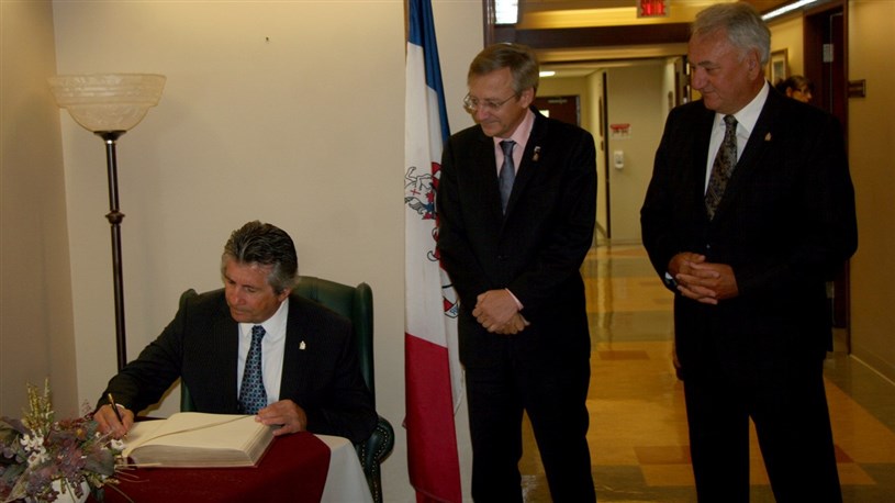 Marcel Drouin, président du comité organisateur de Beauce Art signe le livre sous les yeux attentifs du maire Fecteau et de M. Duhaime.