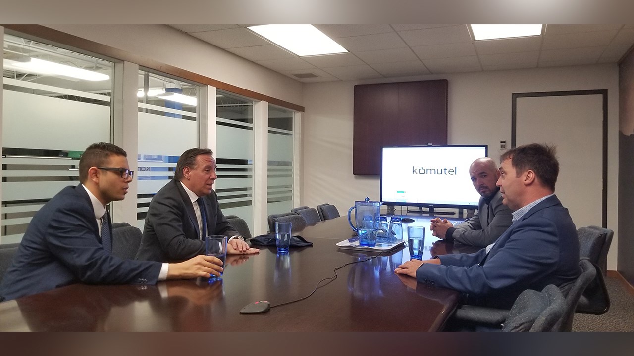 Richard Poulin, chef de la direction de Komutel, a discuté avec M. Legault pendant un bon moment dans une salle de conférence. M. Poulin lui a expliqué les fondements de son entreprise, ses aspirations, ses réussites et ses difficultés.