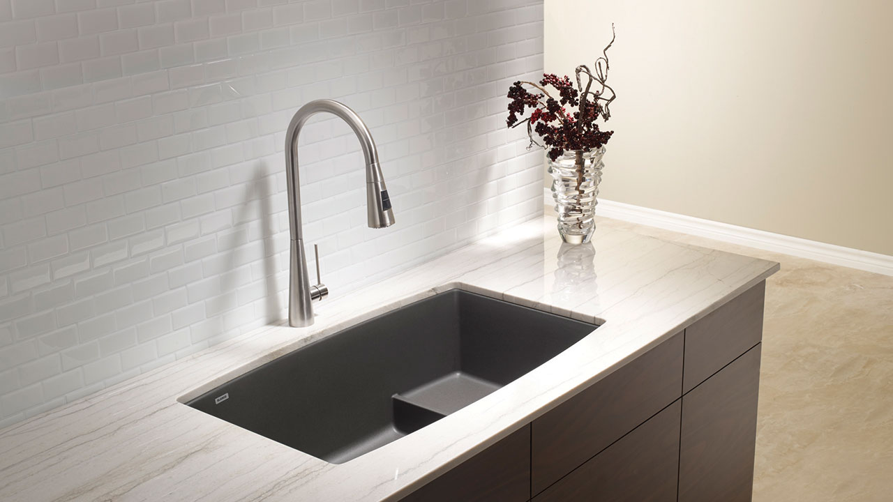 Éviers : Le meilleur matériau est sans contredit le Silgranit. L'acier inoxydable peut s'égratigner, l'émail et la céramique peuvent s'écailler, et l'acrylique ne résiste pas à la chaleur, mais le Silgranit a toujours l'air neuf. Résistant aux égratignures de façon incroyable, et résistant également aux taches, à la chaleur et à l'écaillage, l'évier en Silgranit est l'idéal pour le propriétaire occupé qui recherche quelque chose d'entretien facile. Silgranit est composé à 80 % de granit naturel et d'un acrylique de qualité supérieure. Silgranit est la marque d'évier coloré la plus populaire au Canada. Ce matériau est offert dans six couleurs différentes et dans plus de 100 modèles d'éviers du fabricant allemand Blanco (www.blancocanada.com).