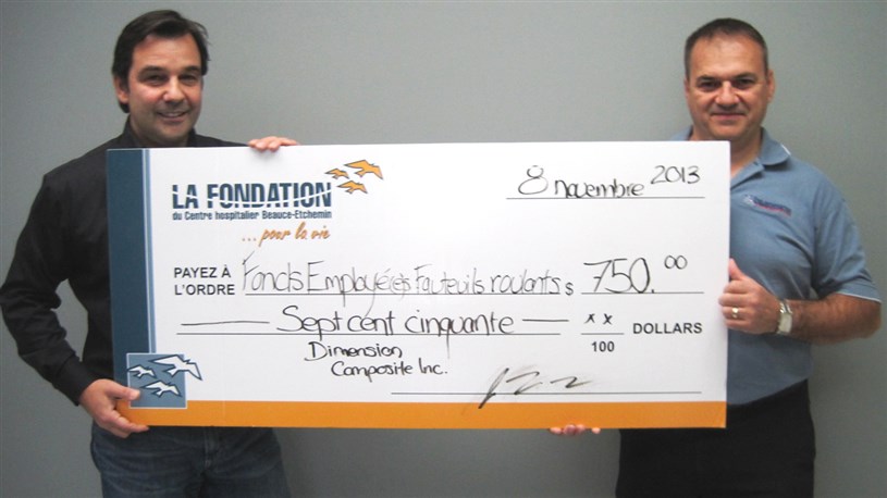 Monsieur Jean-Pierre Tremblay, président de Dimension Composite inc., a remis un montant de 750$ à la Fondation du Centre hospitalier Beauce-Etchemin. L’argent permettra à la Fondation d’acquérir un fauteuil roulant pour les patients.