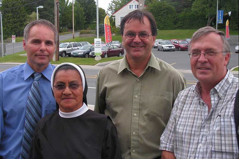 De gauche vers la droite : Renaud Bernard, Service des ressources matérielles de la CSBE, Madre Zoila Lopez (actuellement en tournée de salutations des bénévoles au Québec), Pierre Morin, directeur du Service des technologies de l'information à la CSBE, Pierre Paré, bénévole impliqué dans l'organisme CASIRA et ancien secrétaire général de la CSBE.