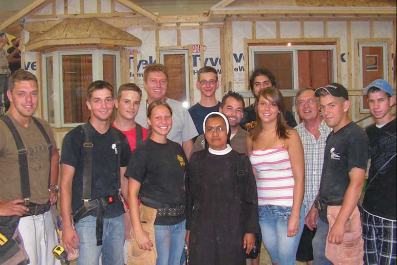 La Madre Zoila Lopez avec un groupe du CFP Pozer en Charpenterie-Menuiserie qui s'est rendu au Guatemala l'an dernier.