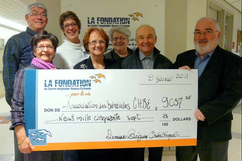 L’Association des bénévoles du CHBE ont remis une somme de 9057 $ à la Fondation du CHBE.  Cet argent a été recueilli à même les dons In Memoriam.  Cette somme permettra de faire l’acquisition de neuf fauteuils ergonomiques.  Selon la Fondation, 164 fauteuils du genre sont nécessaires en gériatrie, unité mère-enfant, pédiatrie, médecine, chirurgie et psychiatrie.  L’organisme souhaite y parvenir par le biais de son programme Fonds des employés dans les usines et organismes communautaires.