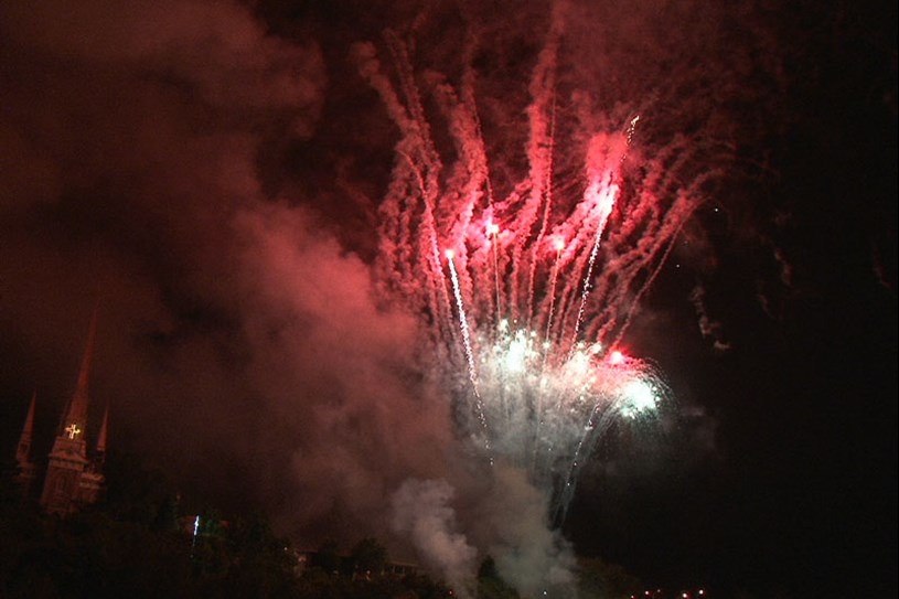 Dès 22 heures, les milliers de spectateurs se sont déplacés sur le pont David-Roy et la 1re Avenue Est pour voir le spectacle de feux d’artifice présenté par la firme Royal Pyrotechnie. La firme de Sainte-Madeleine, près de Saint-Hyacinthe, a lancé tout près de 2000 éléments pyrotechniques pendant plus d’une dizaine de minutes au-dessus de la rivière Chaudière. Les milliers de personnes présentes ont chaudement applaudi au terme du spectacle pyrotechnique.