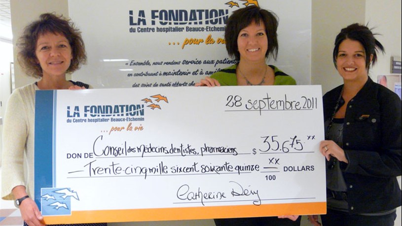 Le Conseil des médecins, dentistes et pharmaciens du CSSS de Beauce a remis un don de 35 675 $ à la Fondation du CHBE dans le cadre de sa campagne de financement annuelle. Cette somme contribuera à l’achat d’équipements pour aider les femmes de la région qui recevront des traitements en gynécologie. La campagne de financement, présidée par Mélanie Morin, permettra l’implantation d’un service d’échographie obstétricale. Ainsi, les femmes de la région qui auront besoin de ce service n’auront plus à se rendre à Québec ou Thetford-Mines pour obtenir ce service.