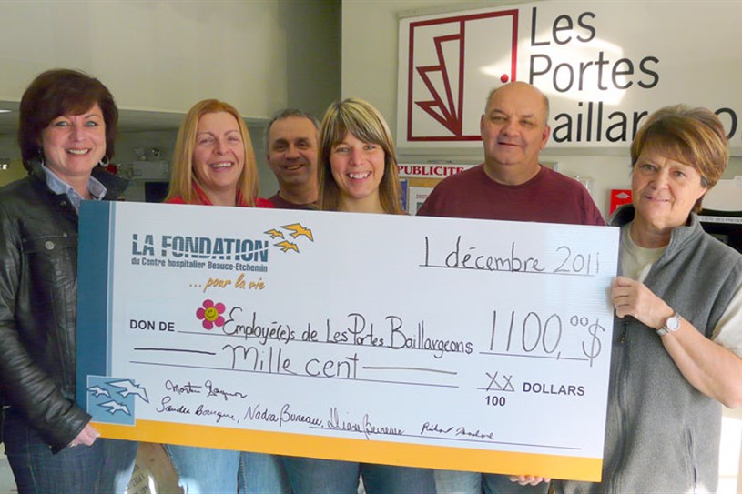 Les membres du comité des relations de travail de la société Les Portes Baillargeon ont fait récemment un don de 1100 $. Ce montant a été recueilli lors d’une activité de financement organisée par les employés de Les Portes Baillargeon. Les dirigeants de la compagnie ont doublé la mise. Ce don permettra l’achat d’un fauteuil ergonomique pour les patients de l’Hôpital de Saint-Georges du Centre de santé et de services sociaux de Beauce.