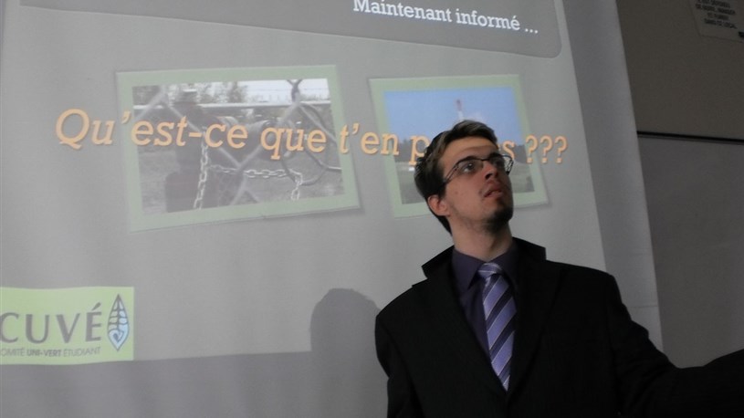 En 2010, il a d’ailleurs entrepris une recherche sur le sujet. Il a aussi pris part à une campagne de sensibilisation sur les enjeux du dossier dans différentes institutions d’enseignement de la région. Celui-ci a aussi procédé à une analyse détaillée des politiques environnementales du Cégep qui a été présentée à la direction générale de l’établissement collégial beauceron.
