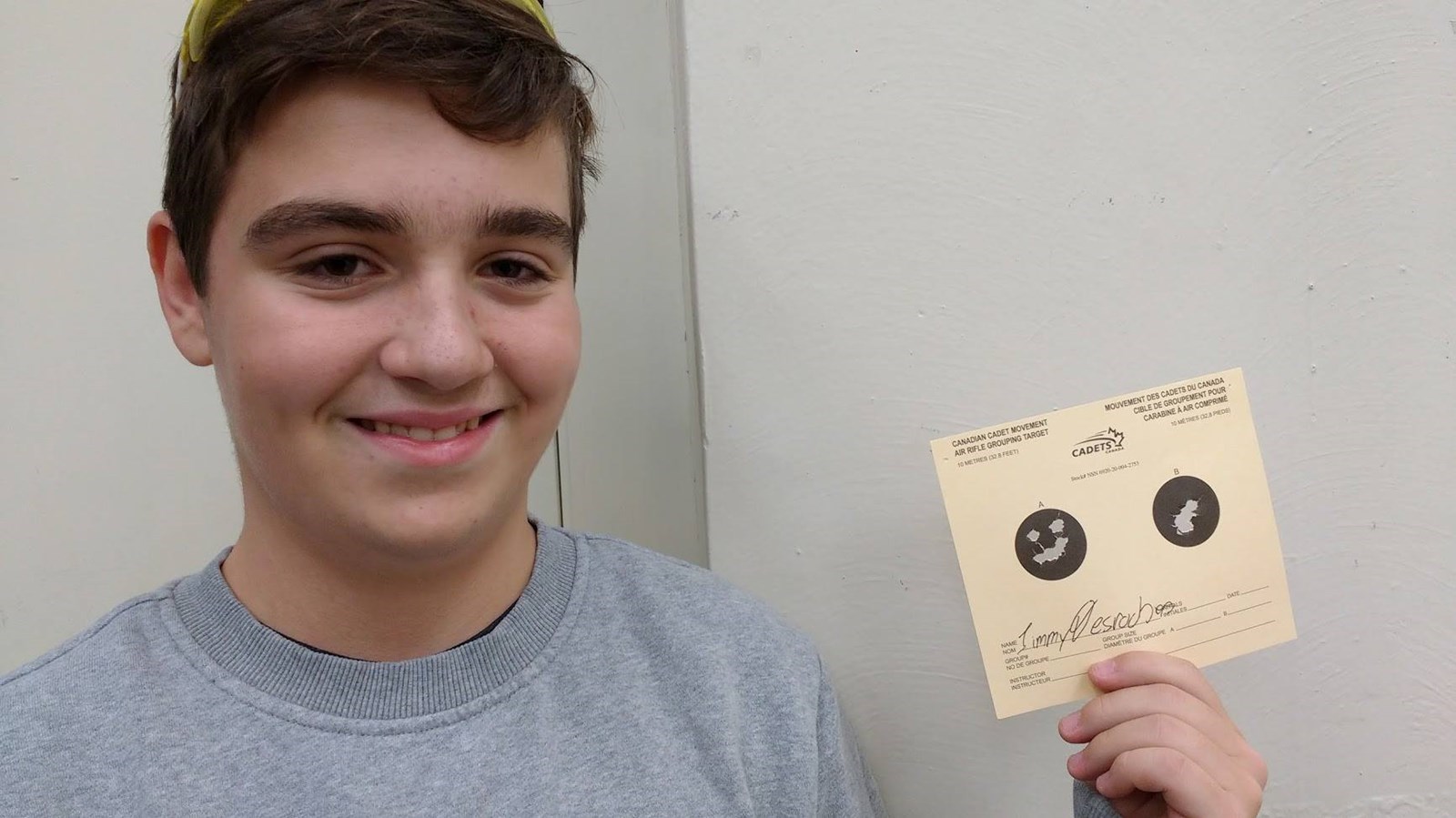 Le mercredi 9 novembre dernier, le caporal Jimmy Desrochers, âgé de 13 ans, est parvenu à réaliser une performance inédite au cours de l'exercice de tir hebdomadaire organisé par l'Escadron 890. Le jeune membre des cadets de l'air est en effet parvenu à créer, dans une cible placée à trente pieds, une image de sourire grâce aux impacts de balles. Les tireurs qui parviendront à se démarquer au cours de ces entraînements pourront être sélectionnés pour participer à la compétition de tir qui aura lieu le 11 mars prochain. Habituellement à Sainte-Justine, l'endroit reste encore à déterminer.