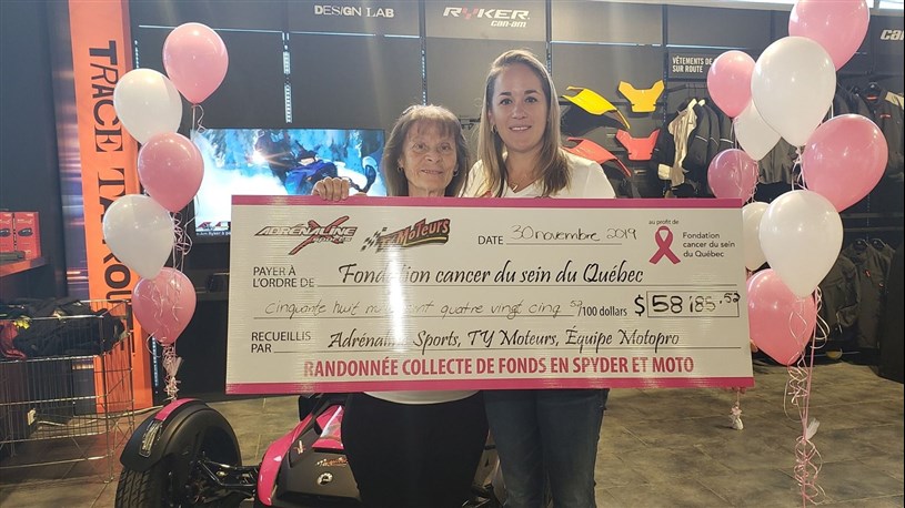 Adrénaline sports Saint-Georges était l’hôte de deux remises de chèque pour la Fondation du cancer du sein du Québec. L’entreprise Canada Vie a remis un don de 3 000 $, alors que Randonnée collecte de fonds Spyder et moto en collaboration depuis 5 ans avec Adrénaline sports Saint-Georges ont dévoilé un montant de 58 185,52 $.