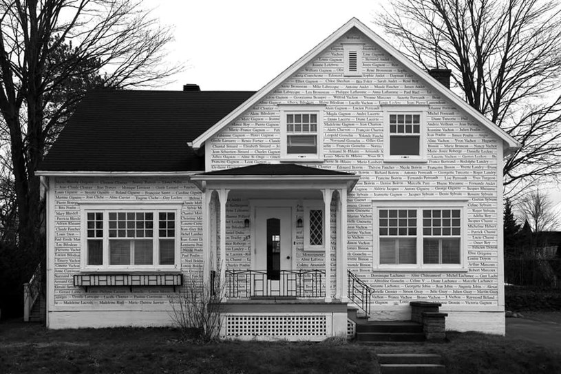 Ainsi, il a imprimé, sur des bandes de papier blanc de la largeur des planches à clin qui recouvrent les murs extérieurs, tous les noms de tous ceux qui ont vécu sur l’avenue Saint-Louis ainsi que les amis et de la parenté qui ont visité le 283.
