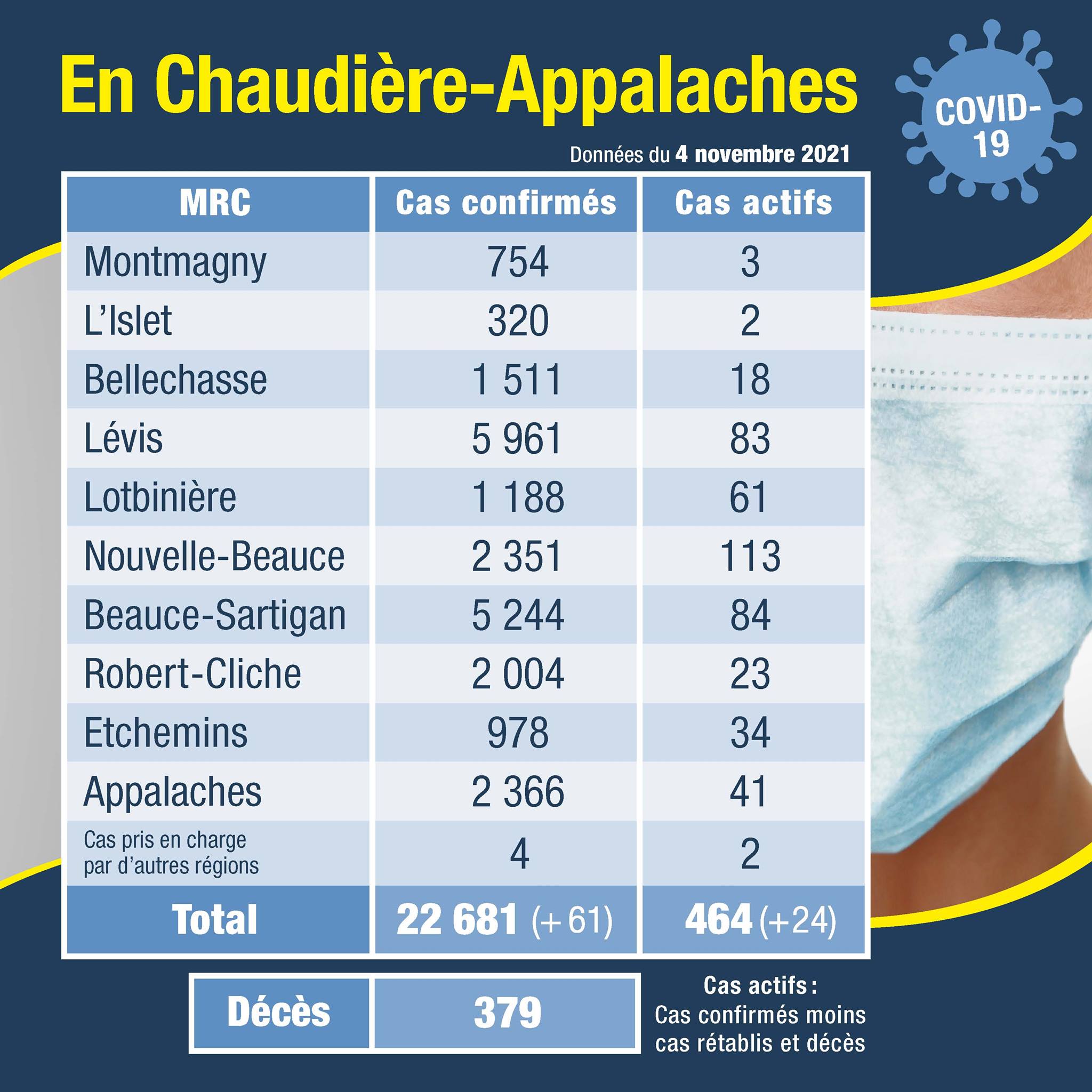 Le nombre de cas actifs pour la région administrative est à 464, en hausse de 24.