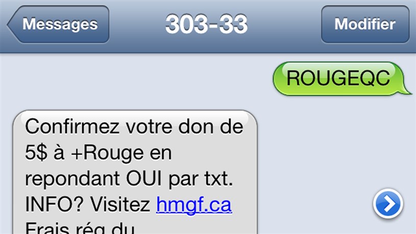 Vous pouvez également faire un don de 5 $ directement par message texte. Il suffit d'envoyer ROUGEQC au numéro 303-33