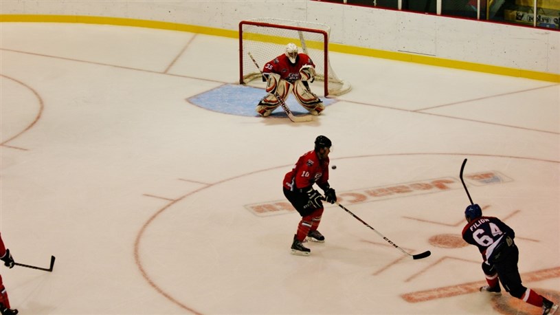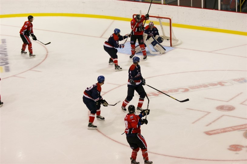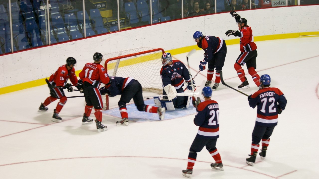 Stéphane Goulet (complètement à droite) a marqué trois buts dans la victoire. Sur cette séquence, il inscrivait son deuxième de la rencontre.