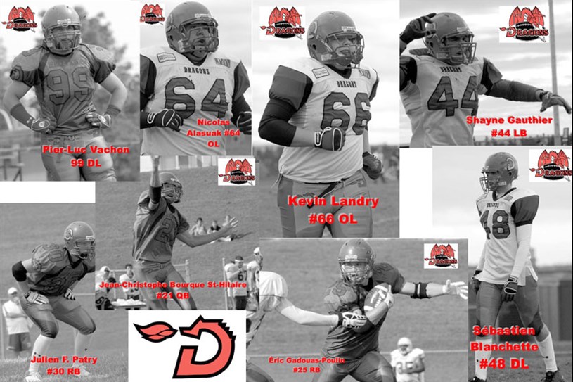 Voici les joueurs sélectionnés des Dragons, OL Kevin Landry #66, OL Nicolas Alasuak #64, DL Pier-Luc Vachon #99, DL Sébastien Blanchette #48, LB Shayne Gauthier #44, QB Jean-Christophe Bourque-St-HIlaire #21, RB Éric Gadouas-Poulin #25 et RB Julien F. Patry #30. Au total, 108 joueurs des 21 équipes de la LFMQ ont été sélectionnés pour ce camp. Seulement 38 seront choisis pour former l’équipe québécoise de la LFMQ.