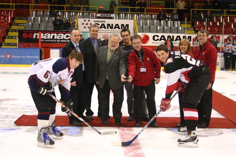 Après cette rencontre a eu lieu la fameuse la mise au jeu officielle à 19 h 30 avec en présence les dignitaires et commanditaires du tournoi. L’hymne national a été chanté par Lyne Gilbert de Saint-Benoît avant que les équipes bantam CC de Saint-Georges et de Beauce-Centre se laissent aller sur la glace. La formation de Beauce-Centre a pris les devants tôt en première période pour l’emporter 3 à 0.