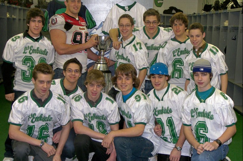 La cinquantaine de joueurs de L’Embâcle Football étaient tous simplement estomaqués par la présence de l’emblème de la suprématie du football canadien. Oeuvrant avec l’Embâcle depuis le début du mois de mars, Robédé a donc pu présenter ce ce joyau remporté en novembre dernier face aux Alouettes de Montréal. Robédé a fait un cours d’histoire sur le football et de la coupe aux joueurs avant d’être photographié en présence des joueurs et du prestigieux trophée.