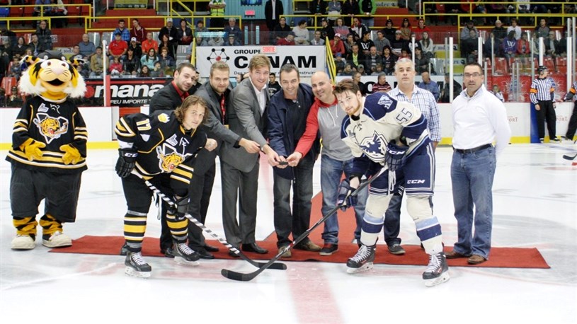 Avant la rencontre, d’anciens joueurs de la LHJMQ provenant de la région ont été présentés à la foule. Jesse Bélanger, Steve Gosselin, Raymond Delarosbil, David Lessard, Hubert Poulin, Philippe Garnier et Keven Veilleux ont effectué la mise au jeu protocolaire.